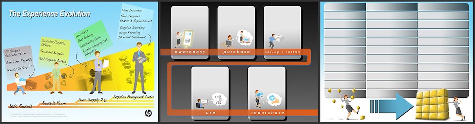 A series of panels describing the process and benefits of HP's Customer Rewards Program.
